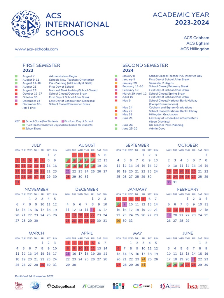 Acs Cobham Calendar Academic Calendar UK | ACS International Schools: Students at ACS Cobham will be asking for seconds after the school won the silver Food for Life catering mark for its meals. The award, handed out by the Soil Association, is given to school . Our three campuses in the UK โ ACS Cobham, ACS Egham and ACS Hillingdon, and one in Qatar, ACS Doha โ all deliver world class education opportunities; our universally acclaimed curriculum includes all .